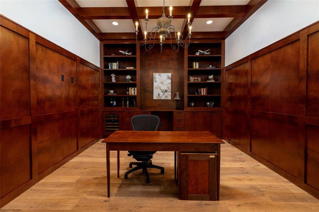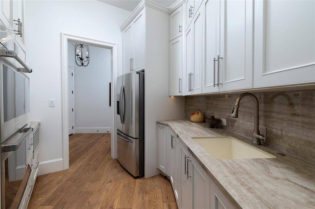 The open-concept kitchen and living area is the heart of the home, anchored by a large center island with breakfast bar and hidden storage. Culinary enthusiasts will appreciate the 7-burner gas cooktop, vent hood, built-in counter-depth refrigerator, and dishwasher. A separate prep kitchen with pantry, double Wolf ovens, microwave, and warming drawer ensures effortless entertaining. The formal dining room provides an elegant setting for gatherings, while the eat-in area overlooks the private backyard oasis.