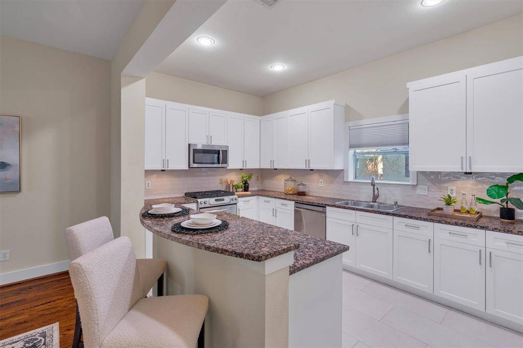 The open main level features hardwood floors and a seamless living and dining layout designed for easy living and entertaining. The kitchen has been updated with white cabinetry, granite countertops, beautiful backsplash, and tile flooring, and offers stainless appliances, gas range and breakfast bar.