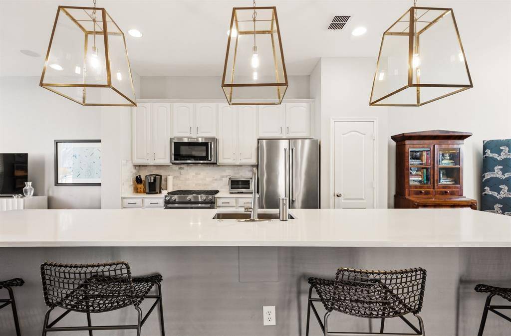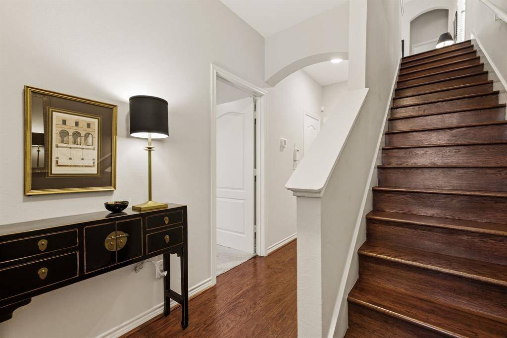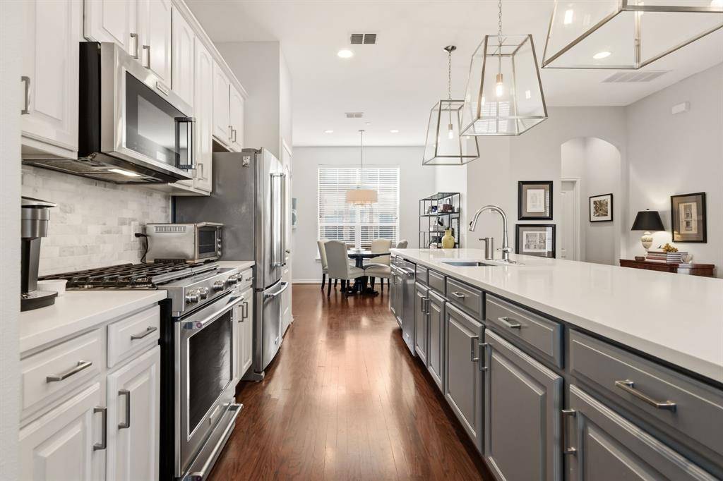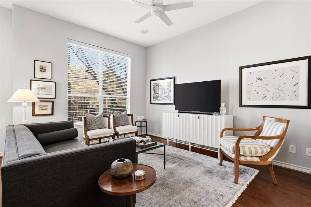 Perfectly located three-story end-unit condo features an open-concept layout filled with natural light, recessed lighting, and gleaming hardwood floors. The first level offers a guest bedroom with an ensuite bath and walk-in closet, along with an attached two-car garage. The second floor is designed for entertaining, showcasing a spacious updated kitchen with a large quartz island, gorgeous lighting and Kitchen Aid appliances, a dining area, living room, powder bath, and private balcony. Upstairs, the oversized primary suite includes an ensuite bath with dual vanities, a soaking tub, separate shower, and an expansive walk-in closet, plus an additional private balcony. Ideally located in the coveted Knox Henderson neighborhood just steps from the Katy Trail, this sleek condo provides walkable access to some of Dallas' best shopping, dining, and entertainment.