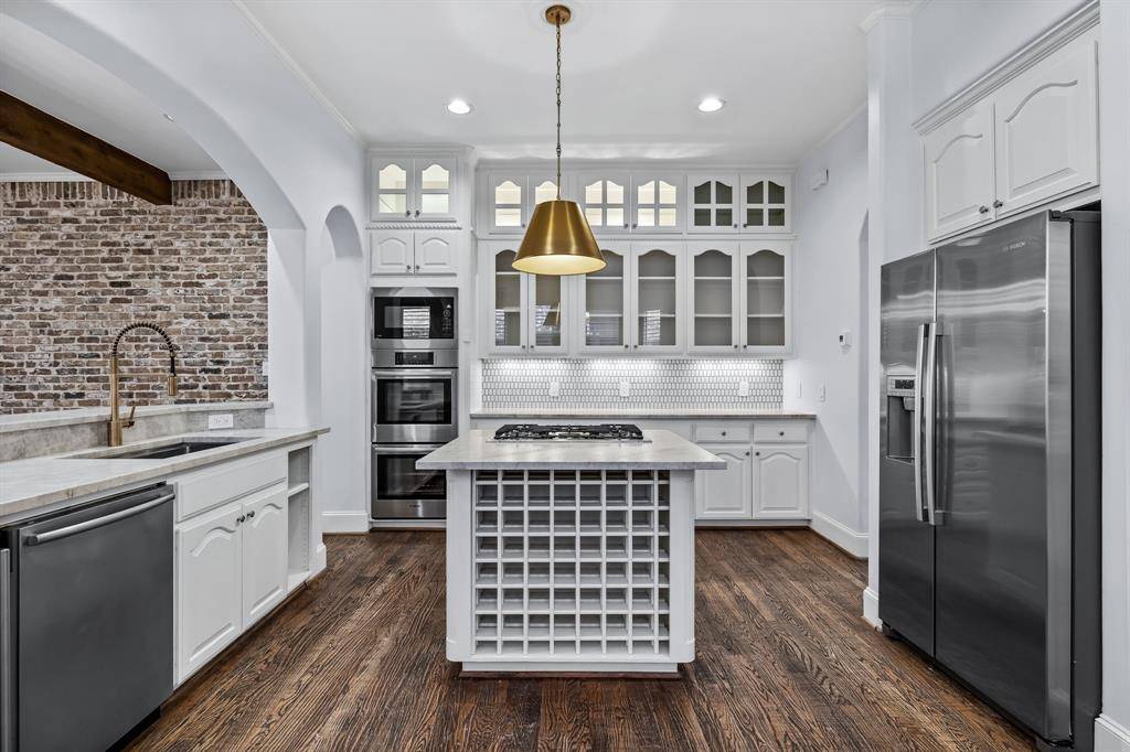 Step inside to find a warm and inviting floor plan. The first floor features an office or intimate living room with built-in cabinetry, a formal dining room that flows seamlessly into the kitchen, and an open-concept chef's kitchen with a large eat-in island, gas cooktop, double ovens, wine fridge, and top-of-the-line appliances. The family room showcases exposed brick accents and offers generous space for a large sectional. A convenient half bath completes the main level.