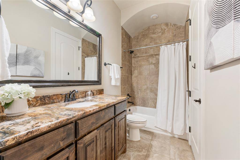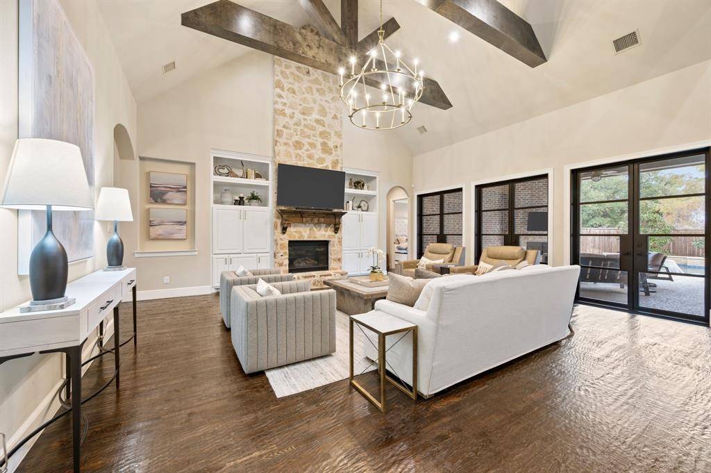 Upstairs, a large multi-use room provides endless flexibility for a media room, playroom, or home gym. Modern French Doors lead to an entertainer's dream east-facing backyard featuring a luxury saltwater pool and spa, oversized covered patio with fireplace, and built-in outdoor grill, ideal for enjoying Texas evenings year-round with ample afternoon shade.