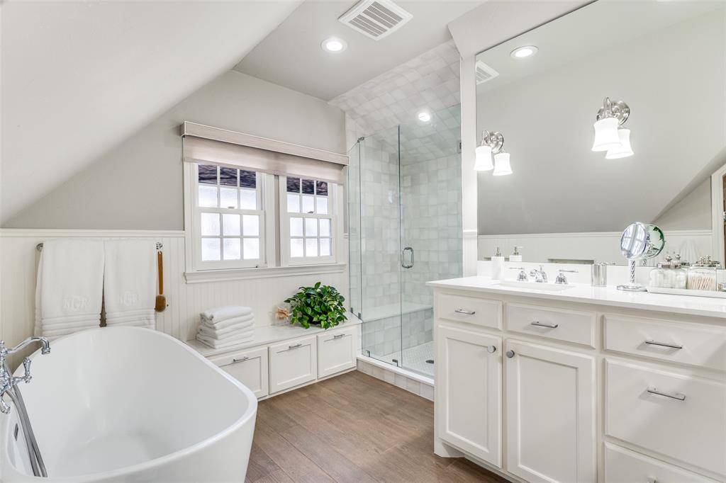 Presenting an exquisite opportunity in the heart of Highland Park, this thoughtfully updated Expanded Tudor Home boasts four generously sized bedrooms and three and a half beautifully remodeled baths, all within a spacious 3,484 square feet. Meticulously maintained, this residence seamlessly blends modern updates with the timeless charm characteristic of the area. With the Immaculate Elegant Interior Design, the home features stunning crown molding, intricate stained-glass windows, and gracefully arched entryways. Vaulted ceilings enhance the expansive open floor plan, ensuring an abundance of natural light throughout the living spaces.