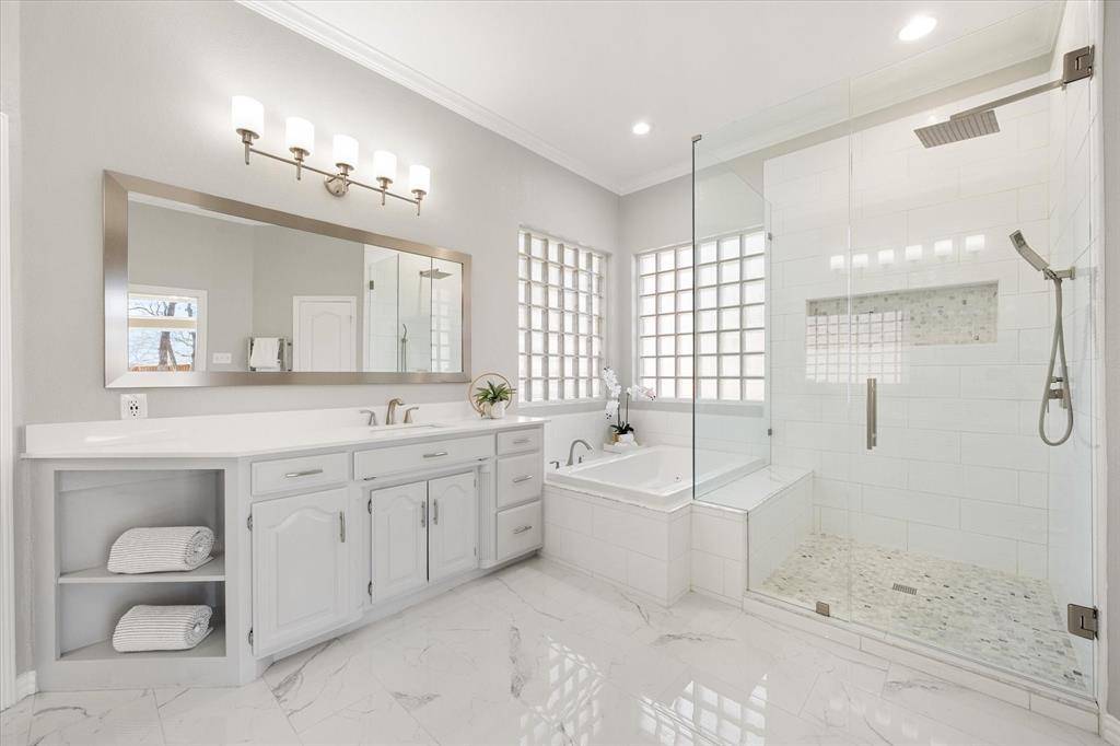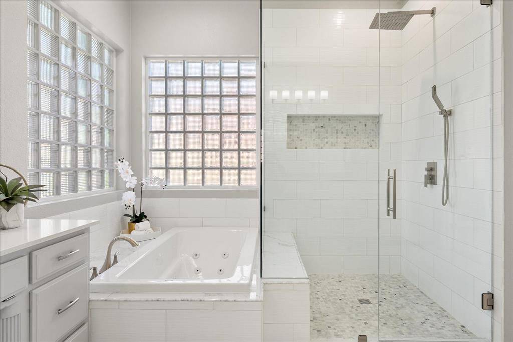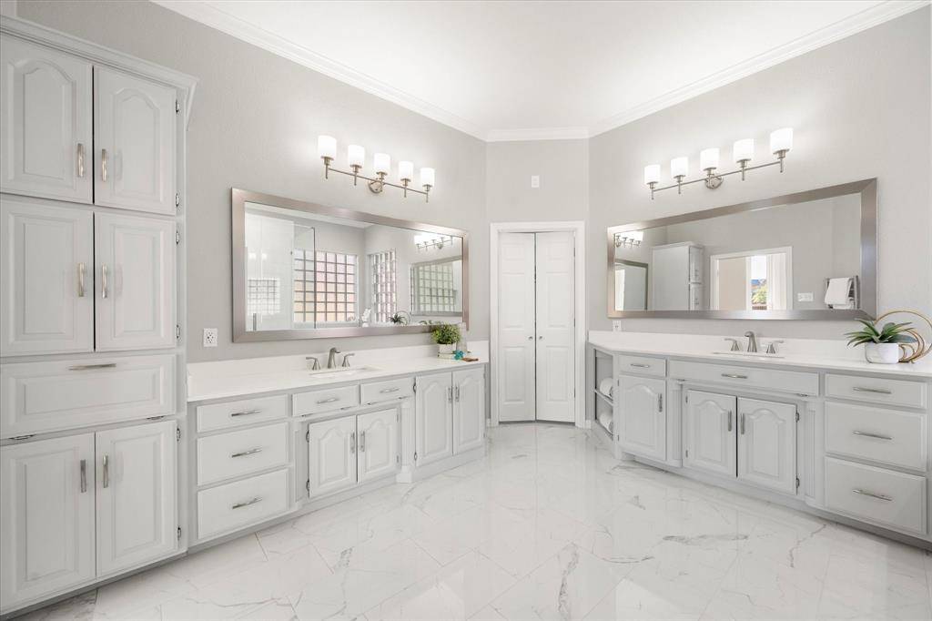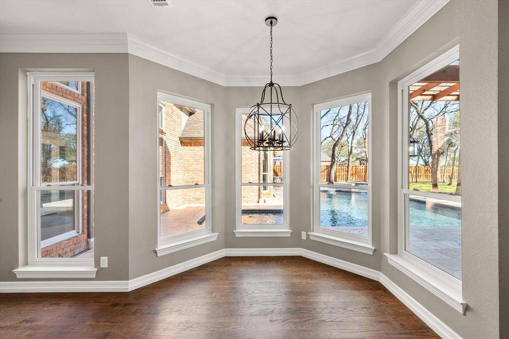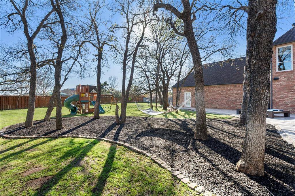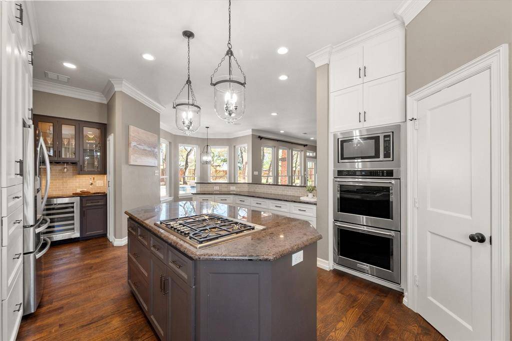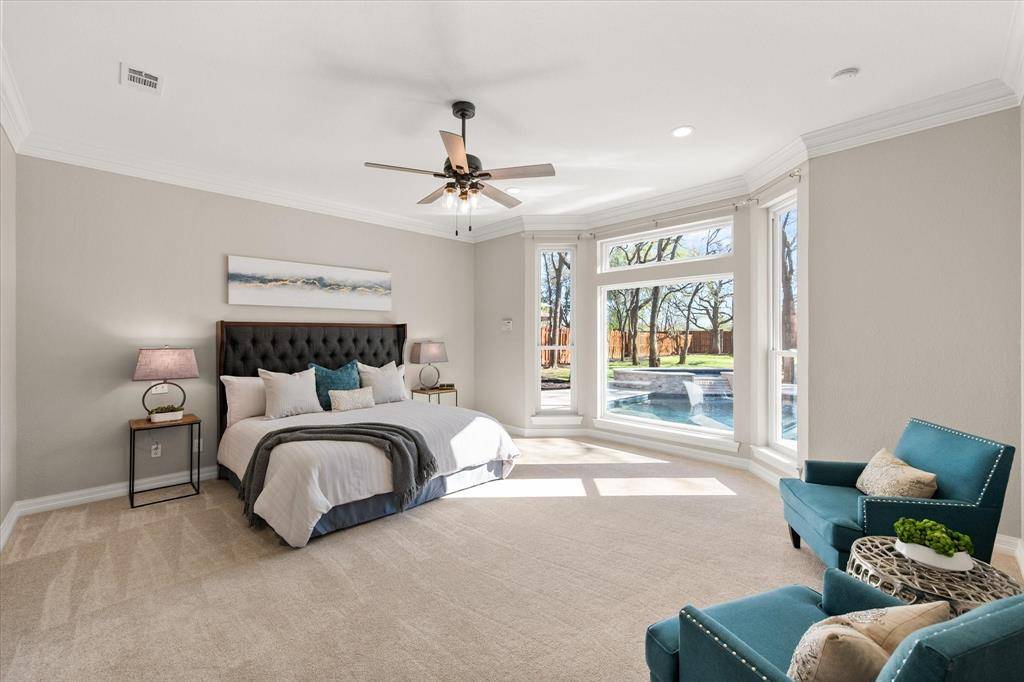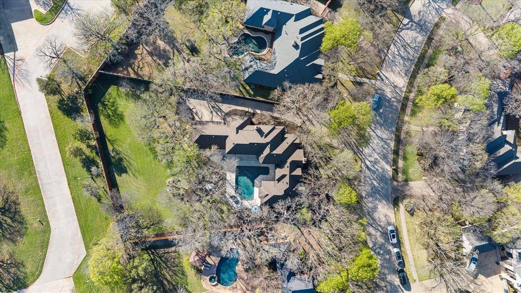 Elegance and modern comfort in this beautifully updated home in sought-after South Ridge Lakes community of Southlake, zoned to award-winning Carroll ISD. Situated on an oversized lot in a quiet, tree-lined cul-de-sac. A grand entry with soaring ceilings welcomes you into an elegant formal living room anchored by a warm fireplace and a wall of windows that flood the space with natural light while showcasing views of the backyard pool. The heart of the home is the open-concept family room, kitchen, and breakfast area, designed for effortless entertaining and comfortable living. Kitchen features custom abundant cabinetry, SS appliances, double ovens, granite counters, large center island, breakfast bar, and a convenient butler's pantry with mini bar. Private primary suite offers a serene sitting area with bay windows overlooking the pool and mature backyard trees. Spa-inspired ensuite bath includes double vanities, jetted tub, separate frameless walk-in shower, and a massive walk-in closet. Quality finishes include hand-scraped hardwood floors, new carpet, Low-E double-pane windows, updated lighting, and fresh interior paint. Central Vacuum, Tesla Charger in 3-car garage. A split secondary bedroom and full bath downstairs provide flexibility for guests or multigenerational living. Upstairs features two bedrooms, Jack & Jill bath, large game room with built-in wet bar and custom cabinetry, ideal for entertaining, homework, or relaxing. Resort-style backyard oasis, featuring an expansive grassy backyard with mature trees surrounding a sparkling pool & spa complete with a shallow tanning deck. Whether hosting summer evenings, unwinding under the covered patio, or enjoying peaceful sunsets poolside, this outdoor space is designed for both relaxation and connection. Residents enjoy community amenities including a pool, tennis & pickleball courts, playground, and clubhouse. Minutes from shopping, dining, parks, and short walk to Carroll SH. Easy commute to DFW Airport.
