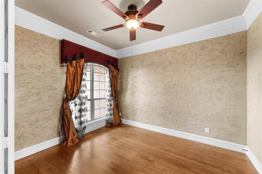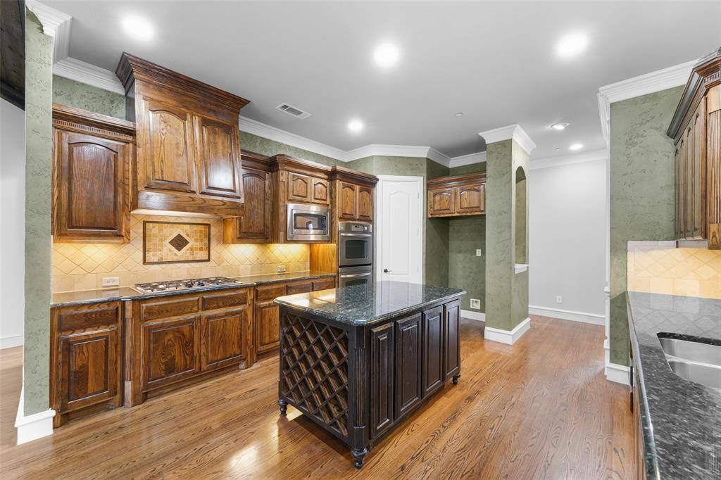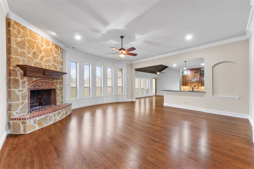 This residence features 4 bedrooms, 3.1 bathrooms, 2 dining rooms, game room, study, flex hobby room, and a 4 car garage, combining architectural detail with a functional layout. Large primary suite on one side of the home. The luxury primary bath features a jetted soaking tub, separate glass enclosed shower, and furniture style Bombay his and hers vanities. Two bedrooms connected by a Jack-and-Jill bath and a separate mother-in-law suite with an ensuite bathroom .An oversized arched oak front door welcomes you into the home and is complemented by a large covered front porch patio. The interior has been freshly repainted, highlighting the craftsmanship throughout. Interior finishes include hardwood flooring, extensive custom millwork, and double crown molding featured in the entry, dining, living, family room, kitchen, breakfast area, and primary suite. The formal dining room features decorative wall paneling, chair rail molding, tray ceiling detail, and large windows providing natural light. The living room has an impressive floor to ceiling stone and brick fireplace with raised hearth, complemented by a dramatic wall of windows framed with custom millwork. The kitchen includes 42 inch oak cabinetry with fluted corner detailing, granite countertops, a center island with built in wine rack, and a custom wood Vent a Hood, along with built in oven and a gas cooktop. The adjacent breakfast area features a vaulted wood paneled ceiling. The luxury primary suite includes a tray ceiling & sitting area with curved windows. A flex room can serve as a hobby room, nursery, exercise room. The property offers privacy & elevation while remaining conveniently located 25 mins from Downtown Dallas. With so many architectural details & custom finishes, this home must be seen in person to fully appreciate the craftsmanship.