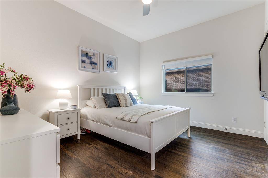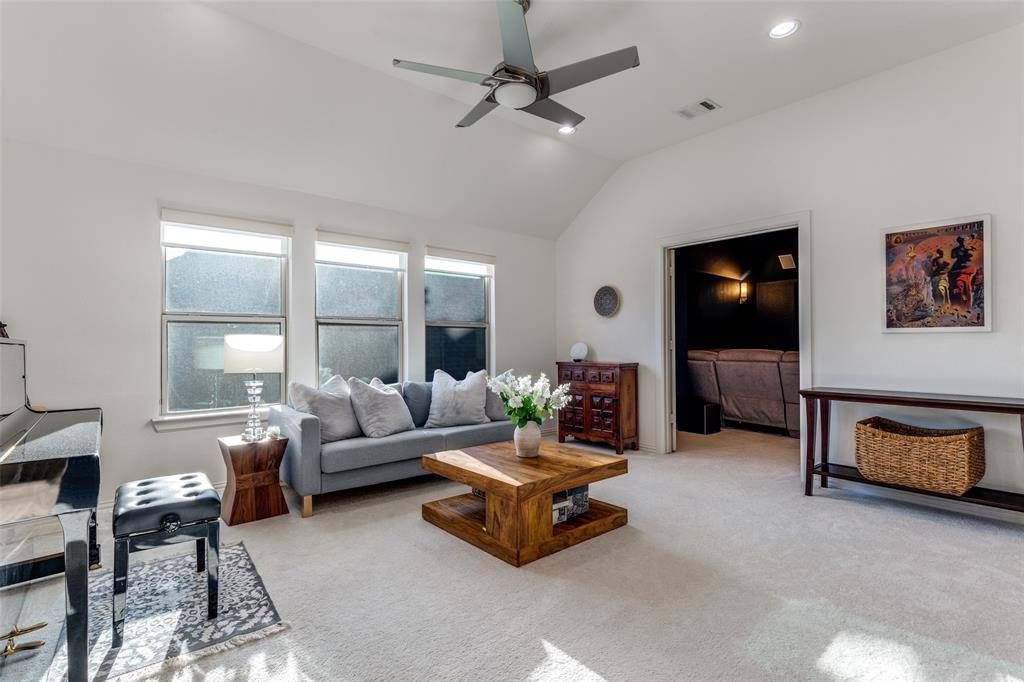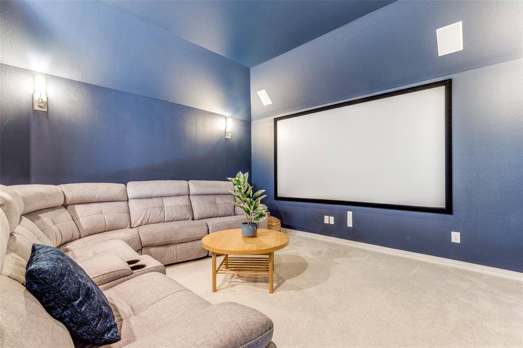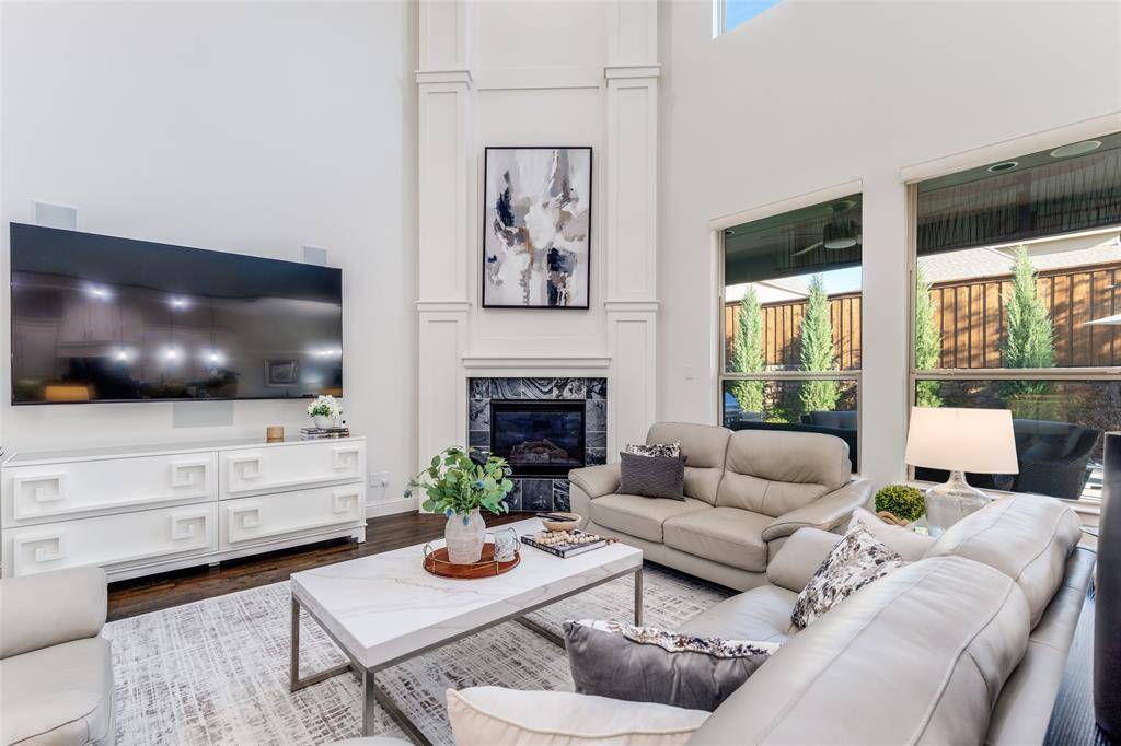 This stunning home in West Frisco immediately impresses with soaring 20-foot ceilings, rich hardwood floors, and a light-filled open layout designed for both everyday comfort and elevated entertaining. The gourmet kitchen features qtz countertops, SS GE appliances, a Monogram vent hood, under-cabinet lighting, and a 5-burner gas cooktop, all seamlessly connected to the expansive living area with elegant coffered ceilings. The highly desirable floor plan includes a private primary suite and guest suite on the main level, while upstairs offers a spacious game room and dedicated media room, ideal for hosting and entertaining. Step outside into a true backyard retreat, complete with a heated saltwater pool and spa, travertine decking, professional landscaping, and a fully equipped outdoor kitchen with a built-in Lion grill—creating a resort-style experience at home.
