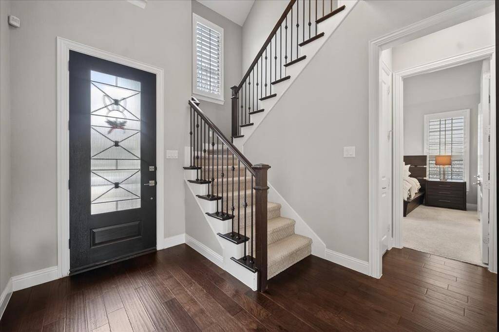 The home welcomes you with a striking brick & stone elevation, manicured landscaping, & inviting front entry. Inside, engineered wood floors, abundant natural light, & tall ceilings create a warm and comfortable atmosphere.