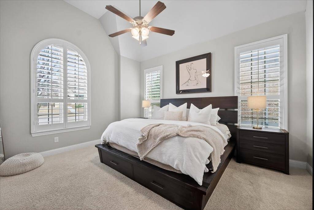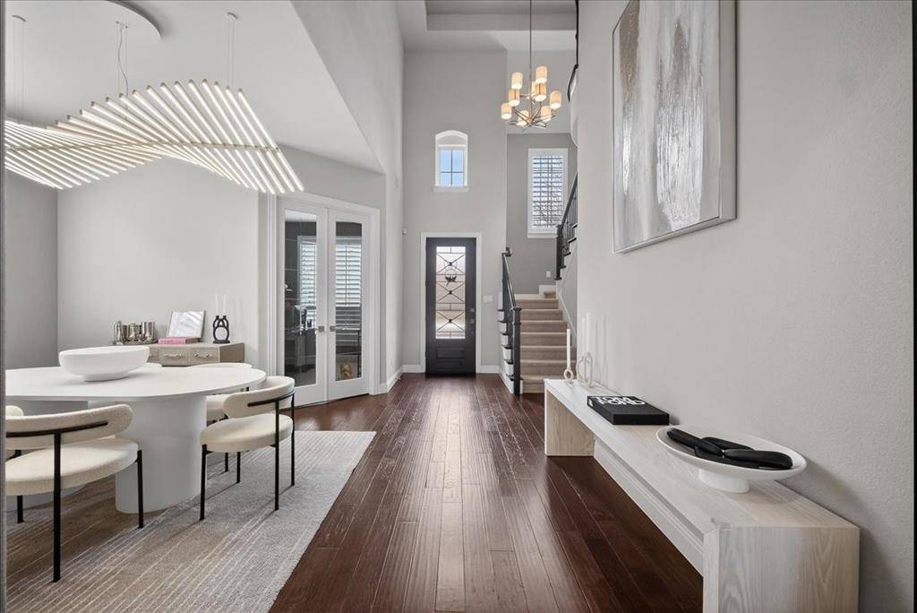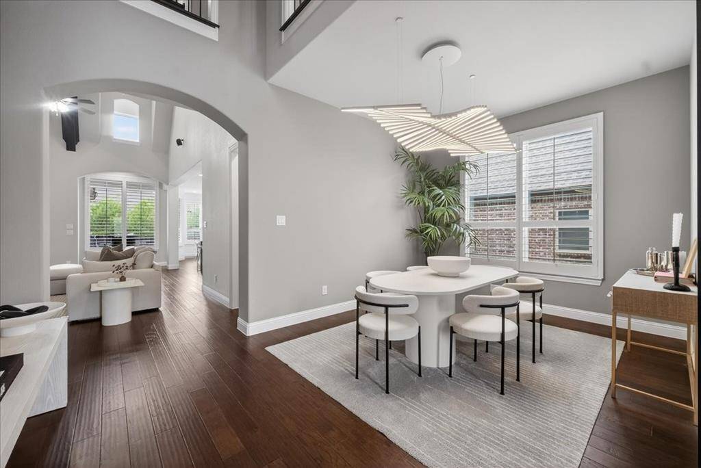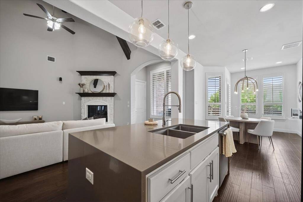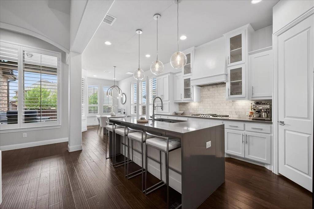 Beautifully upgraded Highland Home in Prairie View featuring a dramatic 19-ft vaulted living room with wood beams, a completely redesigned designer primary bathroom, engineered wood floors, & an upgraded kitchen with quartz countertops & Carrara marble backsplash—located in highly sought-after Prosper ISD.