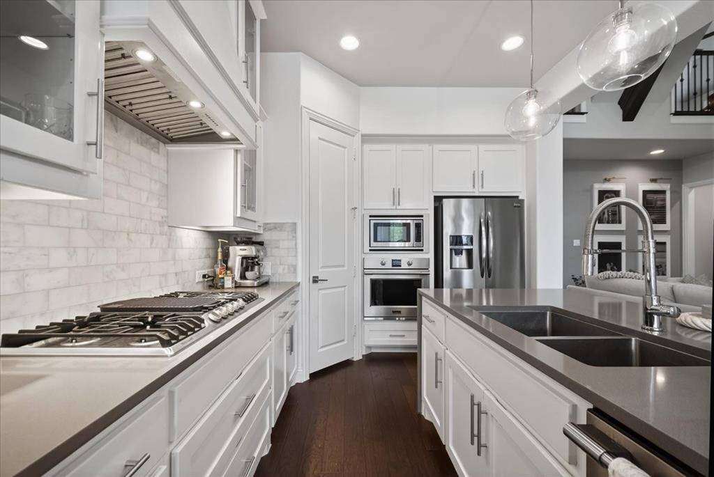 The upgraded kitchen with quartz countertops, a Carrara marble backsplash, Frigidaire appliances, abundant cabinetry, & a large quartz toped waterfall island that opens to the breakfast & living areas.