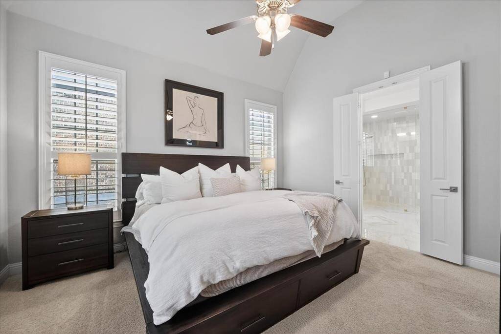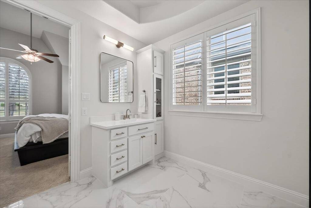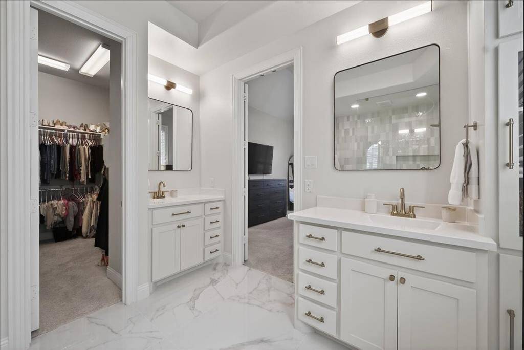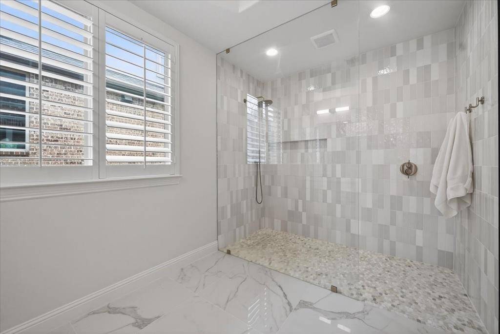 The primary suite is downstairs & offers a spa-like bathroom with an 8x4 frameless glass shower with floor-to-ceiling picket marble tile, marble mosaic shower floor, glazed porcelain tile flooring, dual vanities, & a walk-in closet. A secondary bedroom is also downstairs, ideal for guests or multi-generational living.