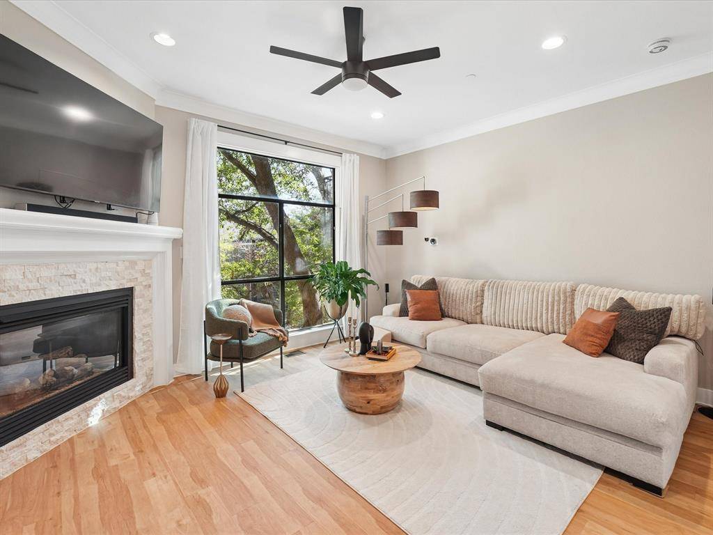 The kitchen has white cabinetry, quartz countertops, and stainless steel appliances, and it opens to a front balcony that fills the space with natural light. The spacious living room offers views of mature trees, a cozy fireplace, and flows seamlessly into a generously sized dining area.