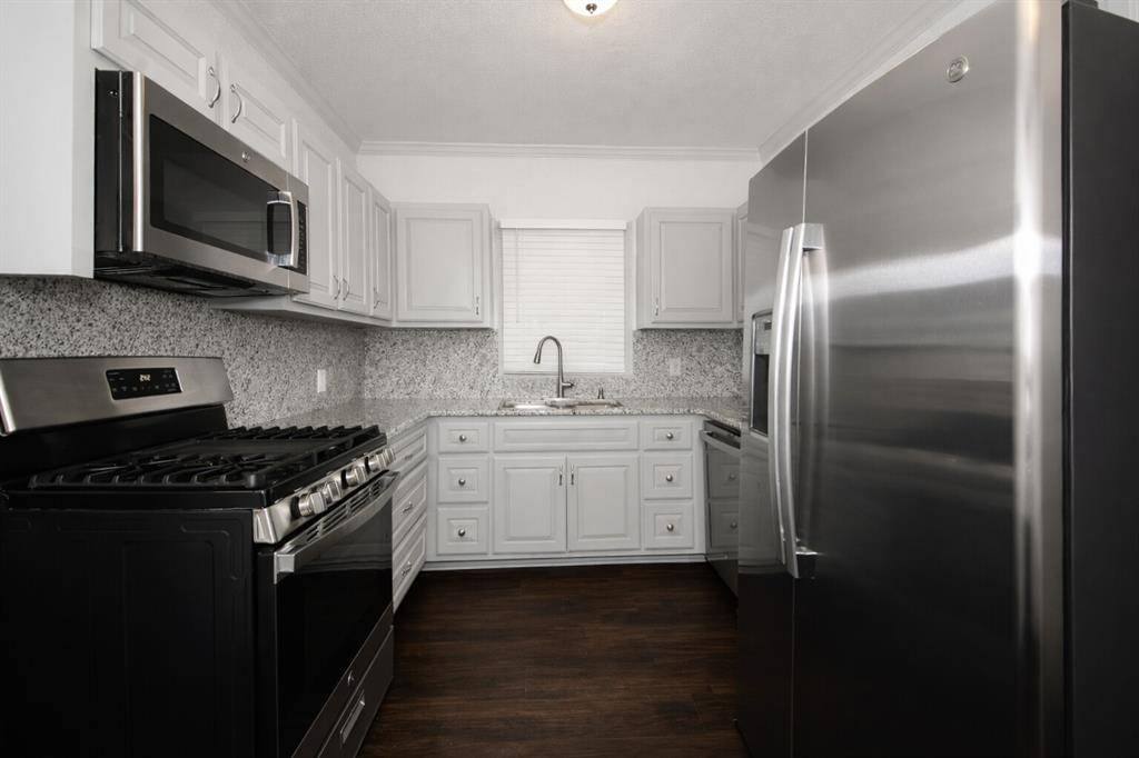 Enjoy new flooring throughout, a bright dining room with a chandelier, and a remodeled kitchen with granite countertops, new cabinets, a pantry, and a gas stove. A laundry room with washer dryer hookups adds convenience.