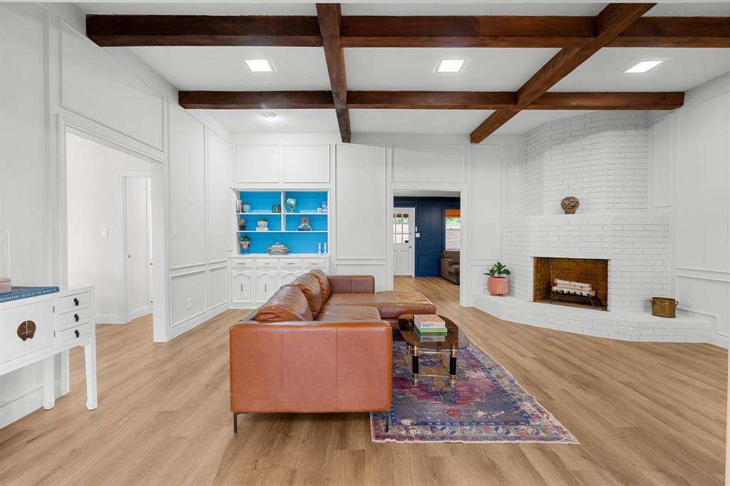 The main living area is anchored by wood beam ceilings, adding architectural character and a sense of warmth throughout the space. Built-ins in both the living room and family room provide functional storage while creating a cohesive, intentional feel.